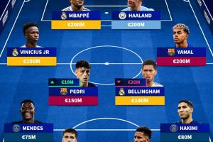 中场:维尼修斯(1.5亿欧,皇马),佩德里(1.5亿欧,巴萨),贝林厄姆(1.4亿欧,皇马),亚马尔(2亿欧,巴萨)